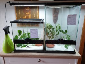 Zwei Quarantäneterrarien aus Glas für Boden bewohnende Chamäleons: Täglich wechselnde spärliche Einrichtung, Küchenpapier auf dem Boden