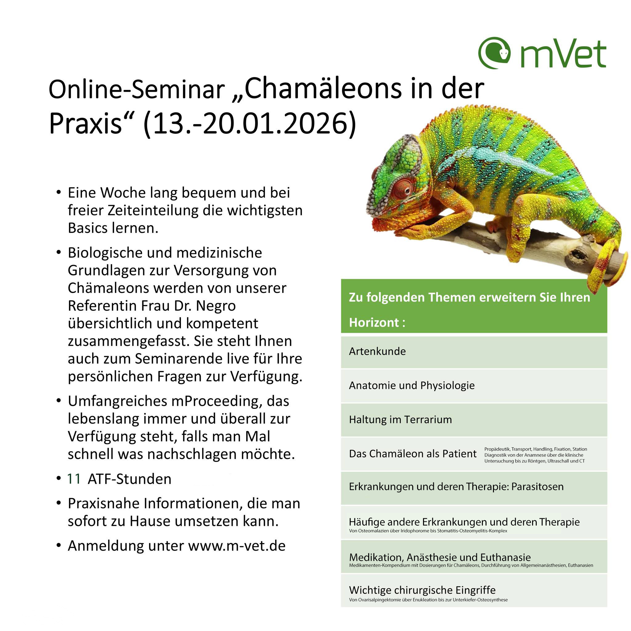2026 gab es erstmals eine ausführliche Vortragsreihe von uns in Kooperation mit mVet Exotenmedizin. Thema ist natürlich das Chamäleon als Patient. Ein weiterer Termin ist geplant und wird hier bekannt gegeben, sobald er feststeht.