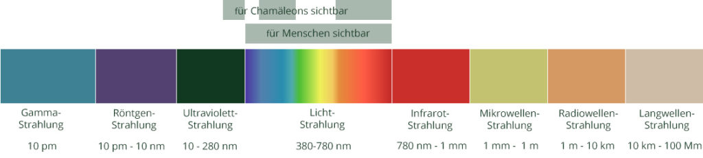UV-B ist die Abkürzung für Ultraviolett-B. Das ist ein Teil der Sonnenstrahlung, die auf die Erde trifft. Nur etwa 5% der Sonnenstrahlen sind überhaupt Ultraviolett-Strahlen. Sie teilen sich je nach Wellenlänge der Strahlung auf in UV-A, UV-B und UV-C. UV-A deckt Wellenlängen von 380 bi 315 nm ab. UV-B ist das für Chamäleons wichtige Ultraviolett und wird in diesem Artikel ausführlicher behandelt. Es beinhaltet Wellenlängen von 315 bis 280 nm, also nur einen ganz schmalen Strahlungsbereich. UV-C-Strahlen mit Wellenlängen von 280 bis 100 nm werden von den obersten Luftschichten der Erdatmosphäre größtenteils absorbiert, kommen also gar nicht auf der Erde an. Ultraviolette Strahlung ist für das menschliche Auge nicht sichtbar.