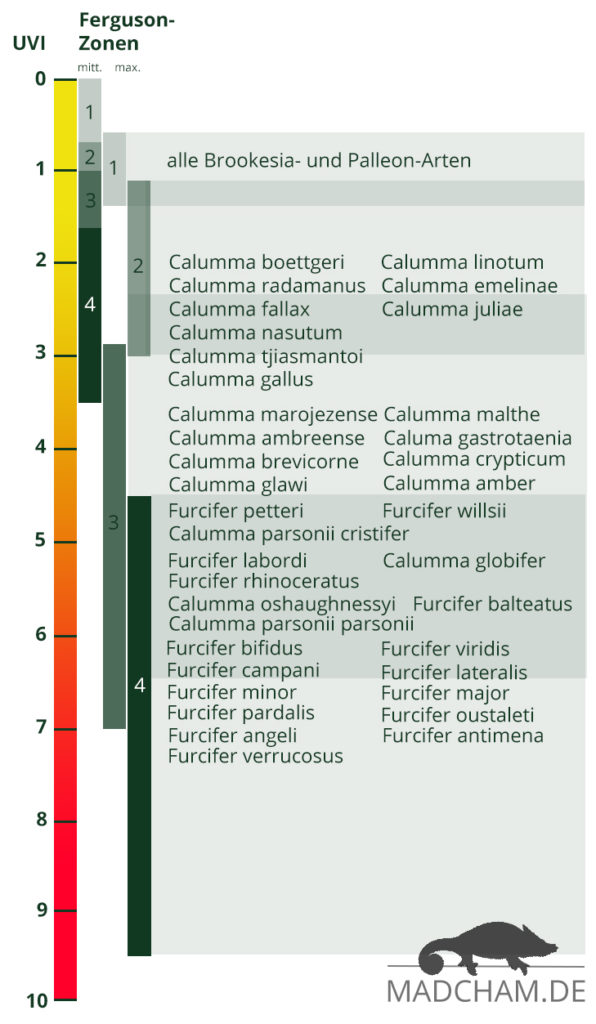 Leider gibt es noch keine Untersuchung darüber, welche Chamäleon-Art auf Madagaskar welchen UV-Index bevorzugt. Wir arbeiten zurzeit an Fundort-Messungen der verschiedenen Arten auf Madagaskar. Auf Grund unserer Beobachtungen über die Jahre schlagen wir die hier rechts gezeigte Einteilung der verschiedenen Arten in eine Art modifizierte Ferguson-Zonen vor. Wir nutzen dabei keine starre Tabelle, sondern eine Leiste mit steigendem UV-Index, da einige Arten im Verhältnis zu anderen deutlich häufiger in der Sonne zu beobachten sind als andere und entsprechend vermutlich auch mit höheren UV-Indizes klarkommen. So befinden sich beispielsweise unseres Erachtens zwar sowohl Calumma brevicorne als auch Furcifer balteatus in Zone 3, Calumma brevicorne sonnt aber seltener und weniger intensiv als Furcifer balteatus.