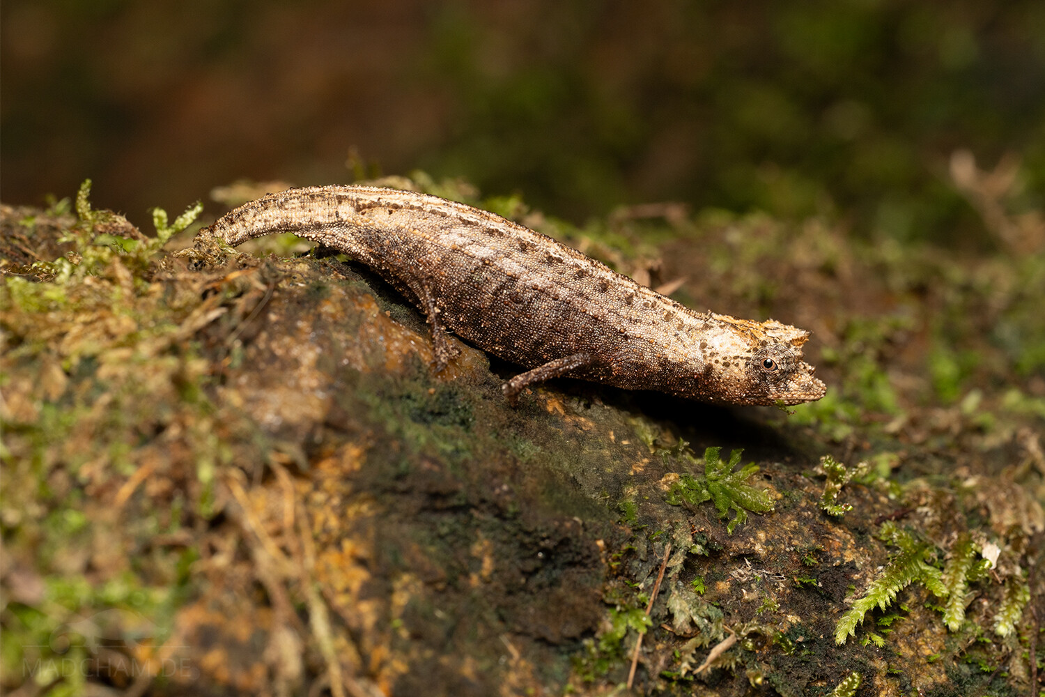 Brookesia karchei mainly occurs in Marojejy national park in northeast Madagascar, where it prefers a humid leaf layer between rocks and moss as habitat. We could find it several times between Camp Mantella and Camp Marojejya – which is not easy with a chameleon of this tiny size!