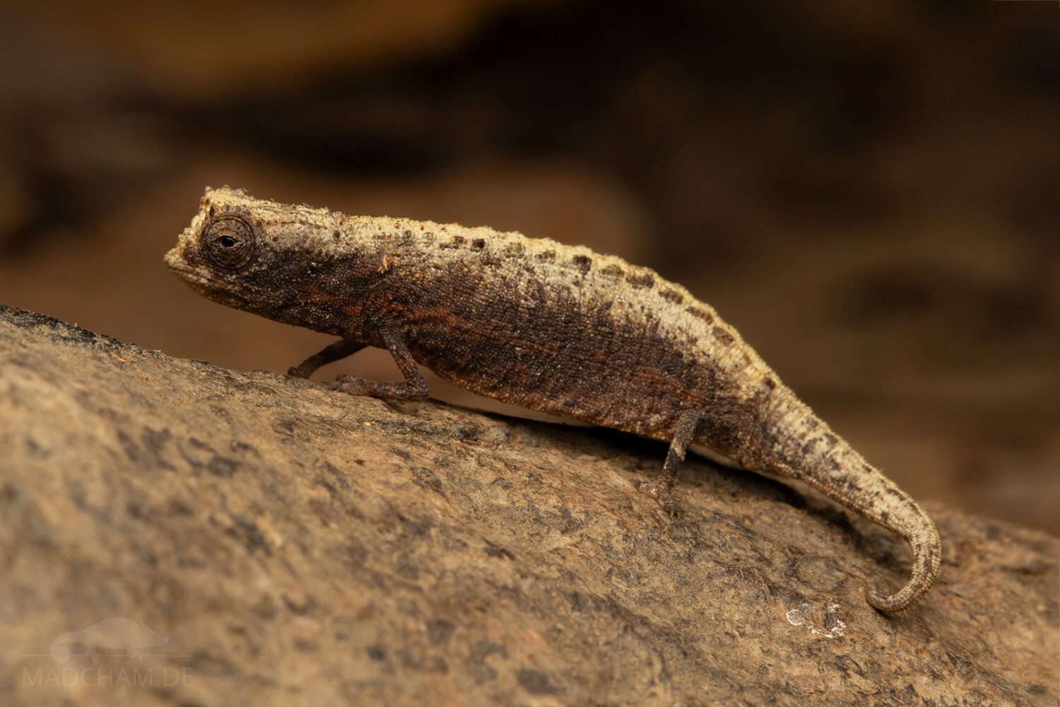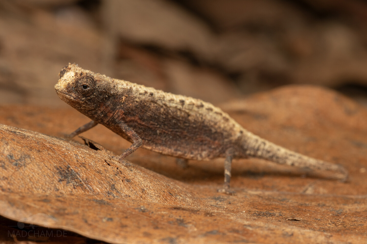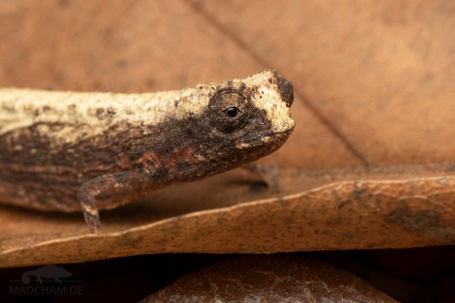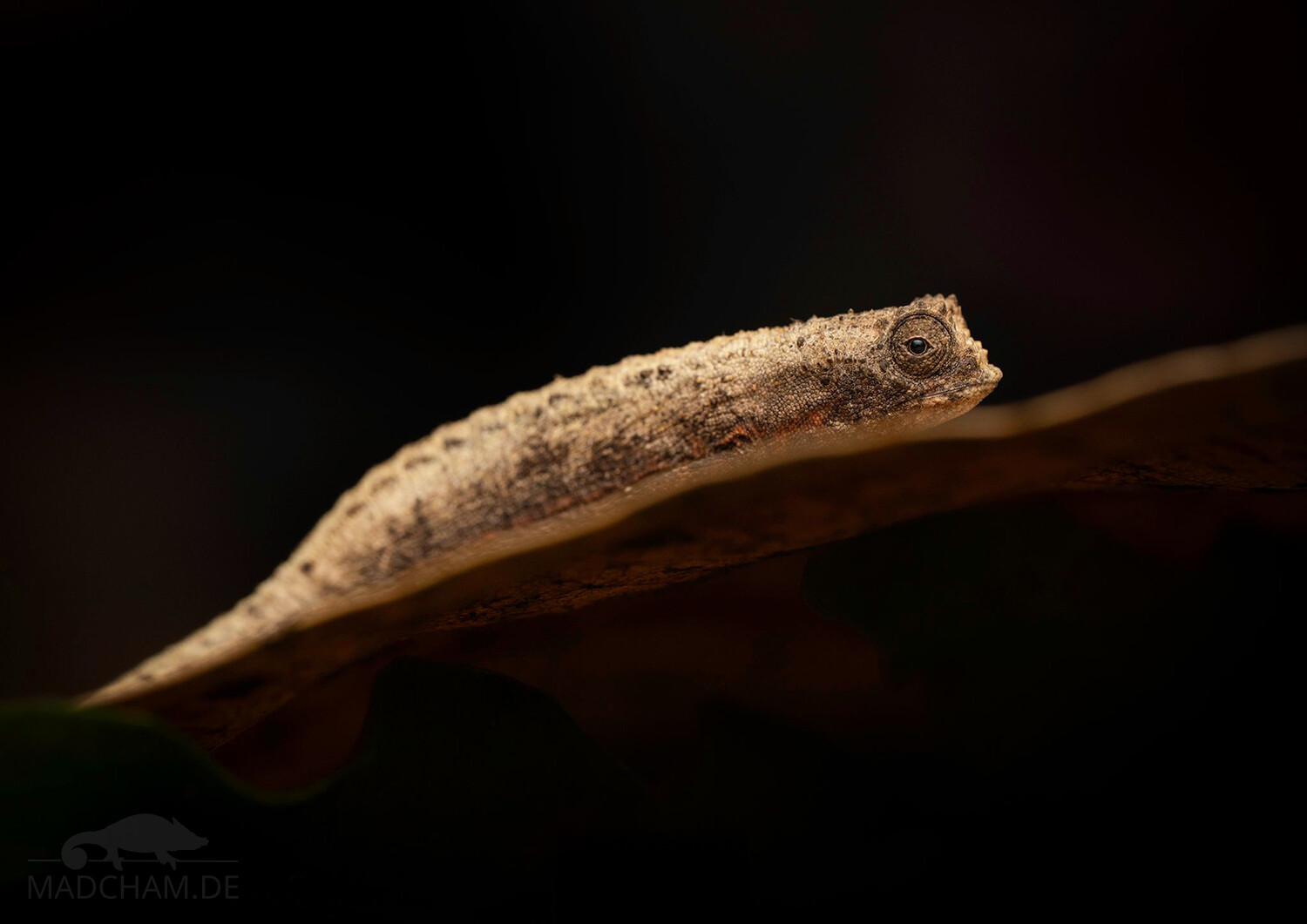 With a total length of 24.9 to 33.8 mm, Brookesia minima is still one of the smallest chameleons in the world today. It is currently the third smallest chameleon after Brookesia micra and Brookesia nana. Together with other, only slightly larger tiny species such as Brookesia tuberculata, it belongs to the minima group named after it. Both sexes of Brookesia minima are quite inconspicuous. They do not have enlarged tubercles above their eyes, and although there are usually six longitudinal lines on the back of their heads when viewed from above, these are irregular and do not form a consistent pattern as in other Brookesia species. Compared to similar species, Brookesia minima appear quite slender with strikingly thin, short arms and legs. Brookesia minima has wavy tubercles on both sides of its back. Both sexes are brown to beige in colour. Many of the small ground chameleons have a darker stripe on their sides. Often, a two-part colouring can be observed, with the upper half of the body on the head, back and tail being lighter than the belly, eyes and gular sac.