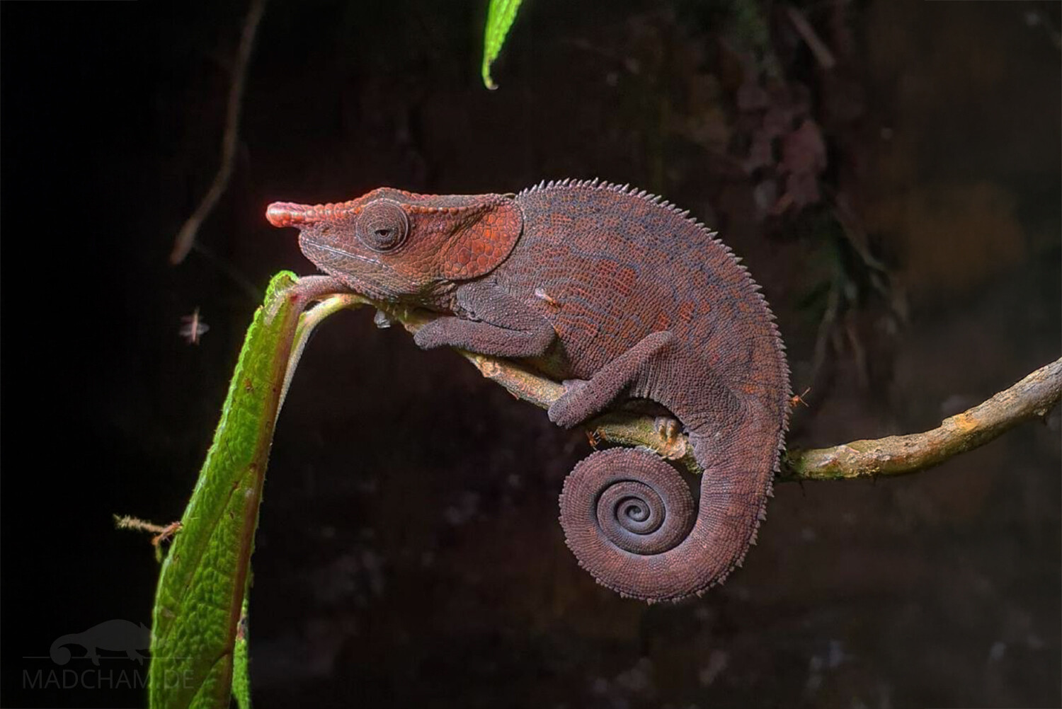 You can find Calumma brevicorne with high probability in Analamazaotra, part of Andasibe-Mantadia national park. These chameleons are quite common there, and you can find them without any problems during night walks along the streets sleeping on branches. And even during the day, you will find some at the edge of the road. Young individuals are easy to find in spring directly in front of the Analamazaotra park office in shrubs and low bushes. The habitat of Calumma brevicorne mainly consists of the primary rainforest with very high trees and much undergrowth. They are much less common in open terrain or close to villages.