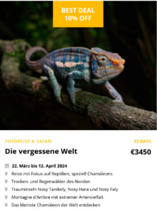 In spring 2026, we will set off again for the north of Madagascar. This trip is mainly dedicated to the many different local forms of panther chameleons and other extremely colourful chameleons of the northwest. Our first destination is the dry forest of Ankarafantsika, where we will encounter the small, colourful Furcifer rhinoceratus and the hard-to-find ground chameleon Brookesia decaryi. On the way further north we will spot Furcifer viridis in the bushes until we finally get to admire the first local forms of the panther chameleons: We will visit animals of the local forms Ankaramy, Ambanja, Beramanja, and Djangoa in their natural habitat. For relaxation, we visit the beach of Ankify for a few days and snorkel with sea turtles on the dream island of Nosy Tanikely. Afterward, the journey continues to Ambilobe. The most colourful local form of the panther chameleon is located near the big city – we spend a whole day tracking down and photographing these chameleons. In Ankarana National Park, with its longest underground cave system in Africa, we meet crowned lemurs and leaf-tailed geckos before heading to our final destination. The Amber Mountain is a true chameleon paradise. In the middle of this enchanting rainforest, we pitch our tents. From the gentle giants of the forest, Calumma ambreense, to rarer species like Furcifer timoni or Brookesia ebenaui, we will experience countless animals on our walks in the forest. Our journey finally ends not far from Diego Suarez on the paradisiacal island of Nosy Hara. Besides a very special local form of the panther chameleon, the second smallest chameleon in the world, Brookesia micra, lives here. The island gives us time to reflect on the journey far away from civilisation.