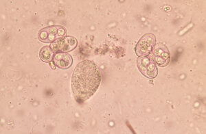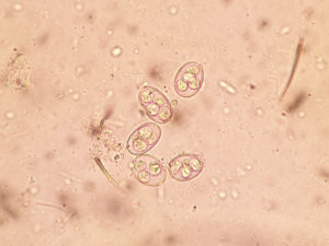 Oocysts of Choleoeimeria ssp. trematode egg in a native faecal smear of a chameleon, magnified 400 times
