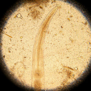 The anterior section of a roundworm in a fresh faecal smear from a chameleon, magnified 400 times