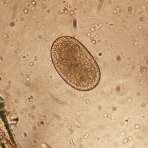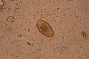 Two trematode eggs under the microscope in a native faecal smear, magnified 400 times