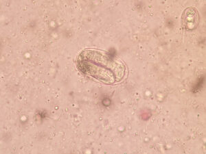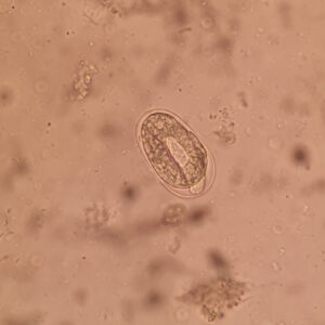Egg containing larvae of Kalicephalus ssp. or Rhabdias ssp. in a native faecal smear from Brookesia stumpffi, magnified 400×