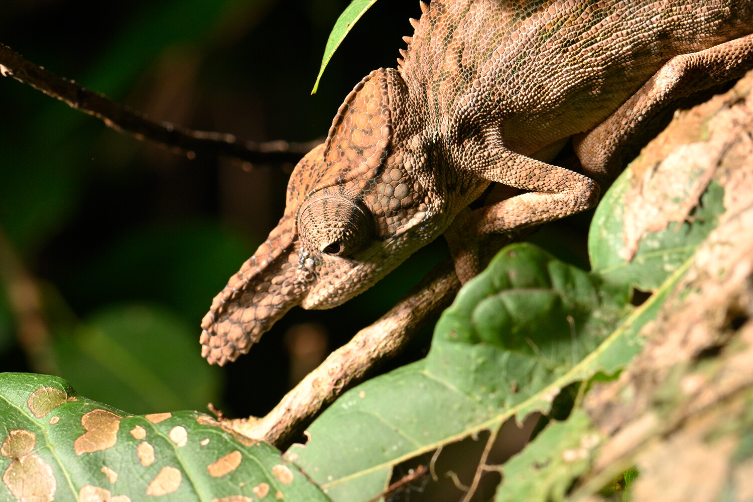 Avec environ 28 cm pour les mâles et environ 12 cm pour les femelles, cette espèce de caméléon appartient à la catégorie des espèces de taille moyenne. Les mâles ont un seul gros nez arrondi, qui est nettement plus petit chez les femelles. Le casque est plat, les écailles du cône sur le dos ne sont proéminentes que dans la partie avant. Les mâles sont pour la plupart gris avec des bandes latérales blanches, en partie aussi vert clair avec des accents turquoise. Lorsqu’ils sont stressés, ils deviennent gris-brun avec un motif de bandes sombres. Ce n’est que lorsqu’une femelle s’approche d’eux que les mâles montrent leur pleine coloration: ils brillent alors d’un vert turquoise et d’un bleu clair avec des lignes jaunes. Cependant, nous n’avons pu observer cette splendide coloration que quelques minutes à la fois – si la femelle se détourne et s’enfuit, la grande coloration du mâle disparaît à nouveau très rapidement. Les femelles de Furcifer rhinoceratus sont généralement plus colorées. Ils sont détendus, simplement roses, parfois avec des motifs verts en forme d’anneau, et toujours avec une queue orange vif. Les femelles excitées ou enceintes sont d’un violet profond avec des bandes sombres.